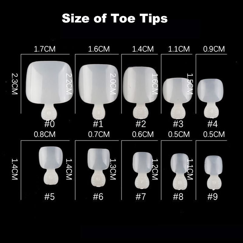 - This Full Cover Toe Tips with box come in different sizes from 0-9 (10pcs of each size makes totally 100pcs), and each size is separately packed.