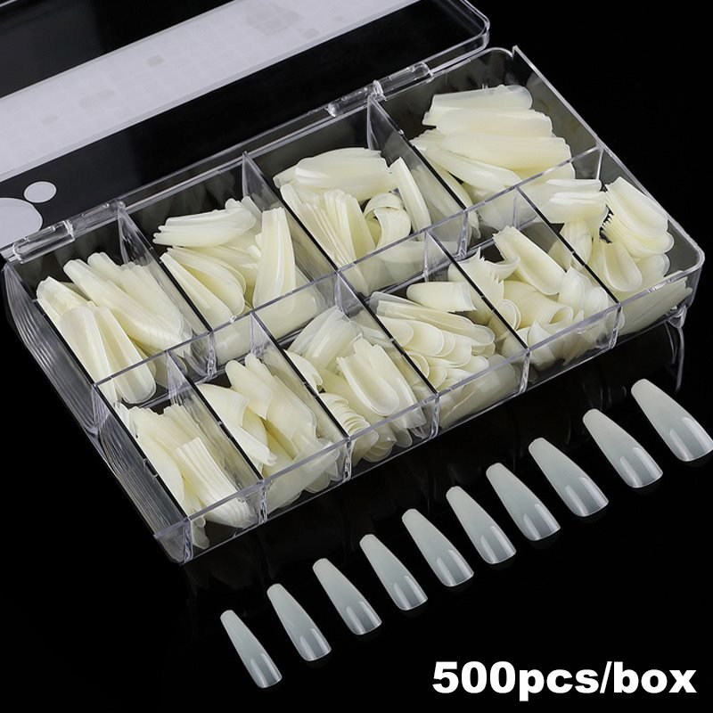 3. Each set of these ultra-thin seamless nail tips includes 1 plastic box+500 nail tips (10 sizes/50pcs each size).