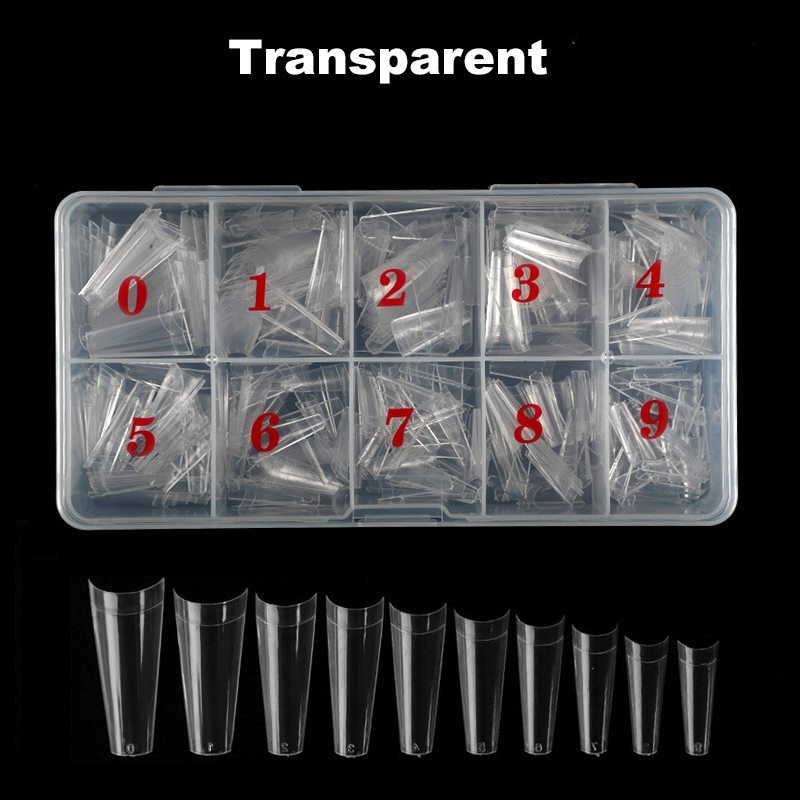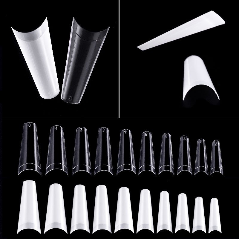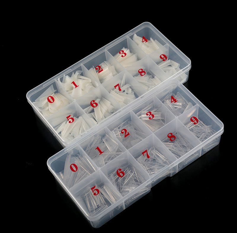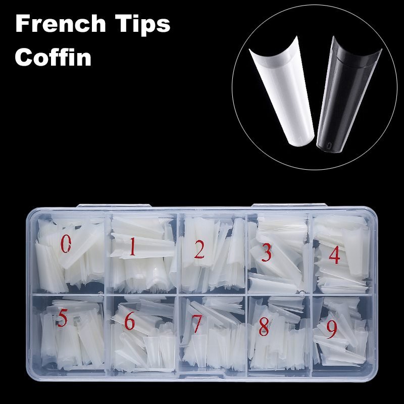 - This Coffin Shape Flat Head French Nail Tips with box come in different sizes from 0-9 (50pcs of each size makes totally 500pcs), and each size is separately packed.