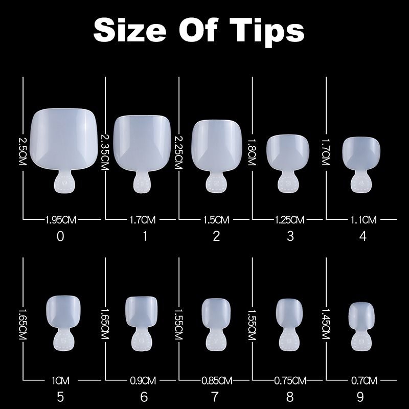 - This Full Cover Toe Tips with box come in different sizes from 0-9 (50pcs of each size makes a total of 500pcs), and each size is separately packed.