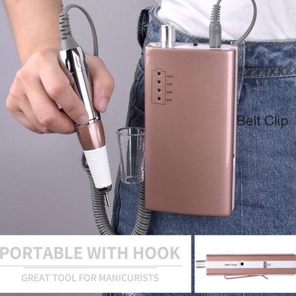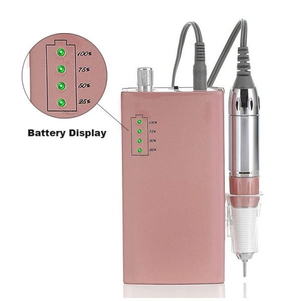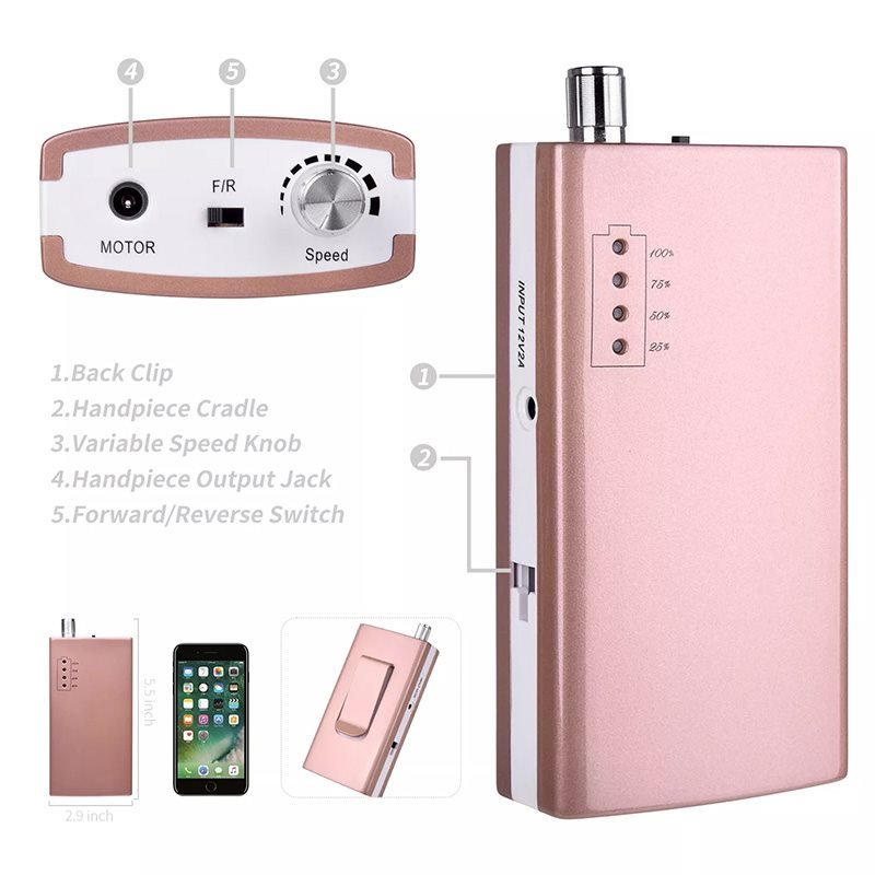 - Rechargeable and Ultraportable: This cordless nail drill Full recharge time of ONLY 2.5 HOURS, continuous operation UP TO 5-6hours( Four electricity displays 25%, 50%, 75%, 100%). The little size is even smaller than Iphone6 plus, it comes with a hook on the machine which could hang on your clothes, or put in your pocket/ bag.